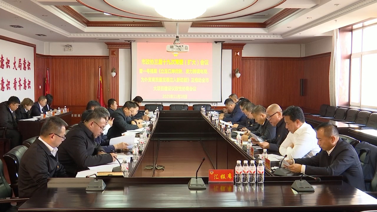 11月18日,市政协三届十九次常委(扩大)会议暨一号提案《立足口岸优势、发力跨境电商、为外贸高质量发展注入新动能》及推动全市大项目建设议政性协商会议召开。会议以“立足口岸优势、发力跨境电商、为外贸高质量发展注入新动能”及推动全市大项目建设为核心议题,通过会前视察、专题汇报、协商议政的方式凝聚共识、汇聚力量。市政协主席、党组书记王殿玉主持会议,市委副书记张戈,市委常委、常务副市长戴冠宇及市政协副主席王殿武、王守斌,市政协秘书长、党组成员马民及市政协常委、各专委会主任、市政协全体机关干部、新增补的政协委员,一号提案相关单位及大项目建设主管部门相关负责人参加会议。