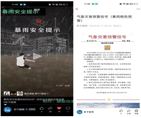 在各类突发灾难和事故报道中,坚定政治立场和人民立场,严守宣传纪律,关爱生命关注弱者,回应社会关切,正确引导舆论,避免“二次伤害”,有效保障群众生命财产安全,对社会稳定和民众心理疏导起到积极作用。同时坚持庄重、客观,注重展示暖心力量,传递抢险救灾正能量。2023年,重点聚焦台风“卡努”影响、极端气象灾害和灾后重建开展新闻宣传。在《东宁新闻》中播出防汛及灾后重建类新闻79条。通过东宁融媒公众号、东宁发布微信公众号等新媒体平台刊播相关新闻资讯、汛期安全提示、防灾减灾科普视频等累计300余条。被中央广播电视总台及省电视台等省级以上媒体采用49条。
