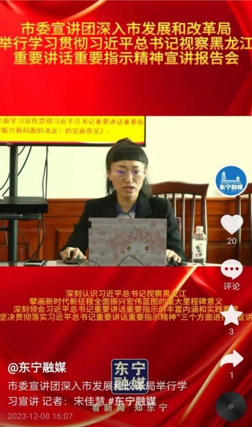 注重改进创新。成功入驻抖音、头条、腾讯视频等新媒体传播矩阵,传播渠道持续拓宽。规范运营各类新媒体账号,实现集中传播、集中发声。贯通“新闻+政务+服务”,注重表达方式创新,融合“活动+报道+直播”,持续构筑全面立体宣传格局,推出《<黑龙江省电动车管理条例>2023年5月1日起施行,你关心的都在这里》《东宁劳动者十二时辰》等一大批“爆款”“网红”融媒体产品。其中短视频《东宁劳动者十二时辰》荣登“学习强国”2023年春夏季全国县级融媒优秀作品榜,在培育价值观方面起到良好的助力。